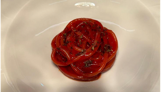 Le prime prove erano sbilanciate in acidità e da qui l’idea di aggiungere un estratto di ciliegia all’acqua di pomodoro ridotta in fase di mantecatura: il territorio che viene in aiuto. Per donare il profumo fresco del pomodoro appena colto, ho cotto lo spaghetto direttamente nell’acqua di pomodoro. Infine per riprendere il profumo della marinara ho terminato il piatto con della polvere di caffè e origano.