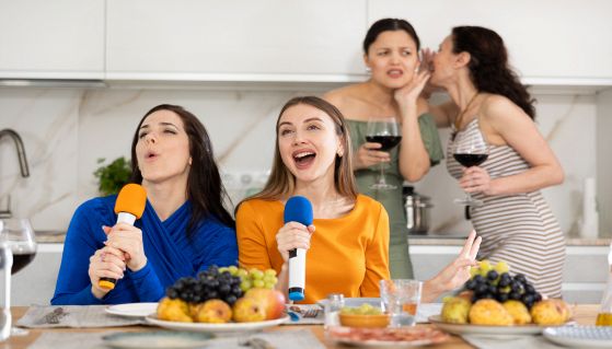 Pranzo tra amiche, alcune cantano e altre spettegolano