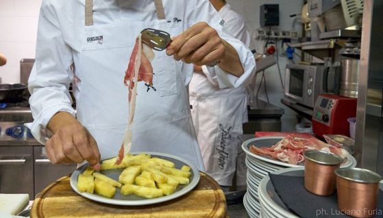 Quella di Franco Pepe è una pizza a forma di cono, che impiega la fonduta di Grana Padano, al prosciutto crudo San Daniele e alla liquirizia. È una sorta di scrigno fritto, che delizia le papille gustative e che stupisce