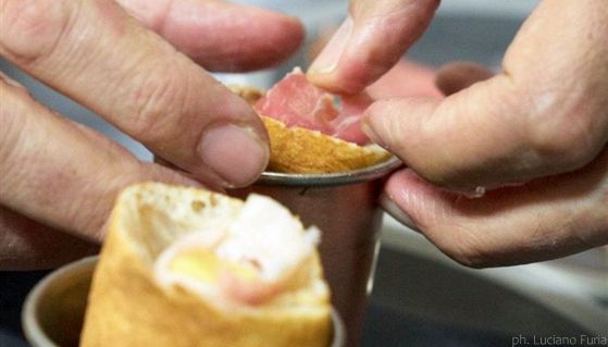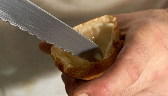 Una volta fritto, viene svuotato tagliandone una sua estremità.